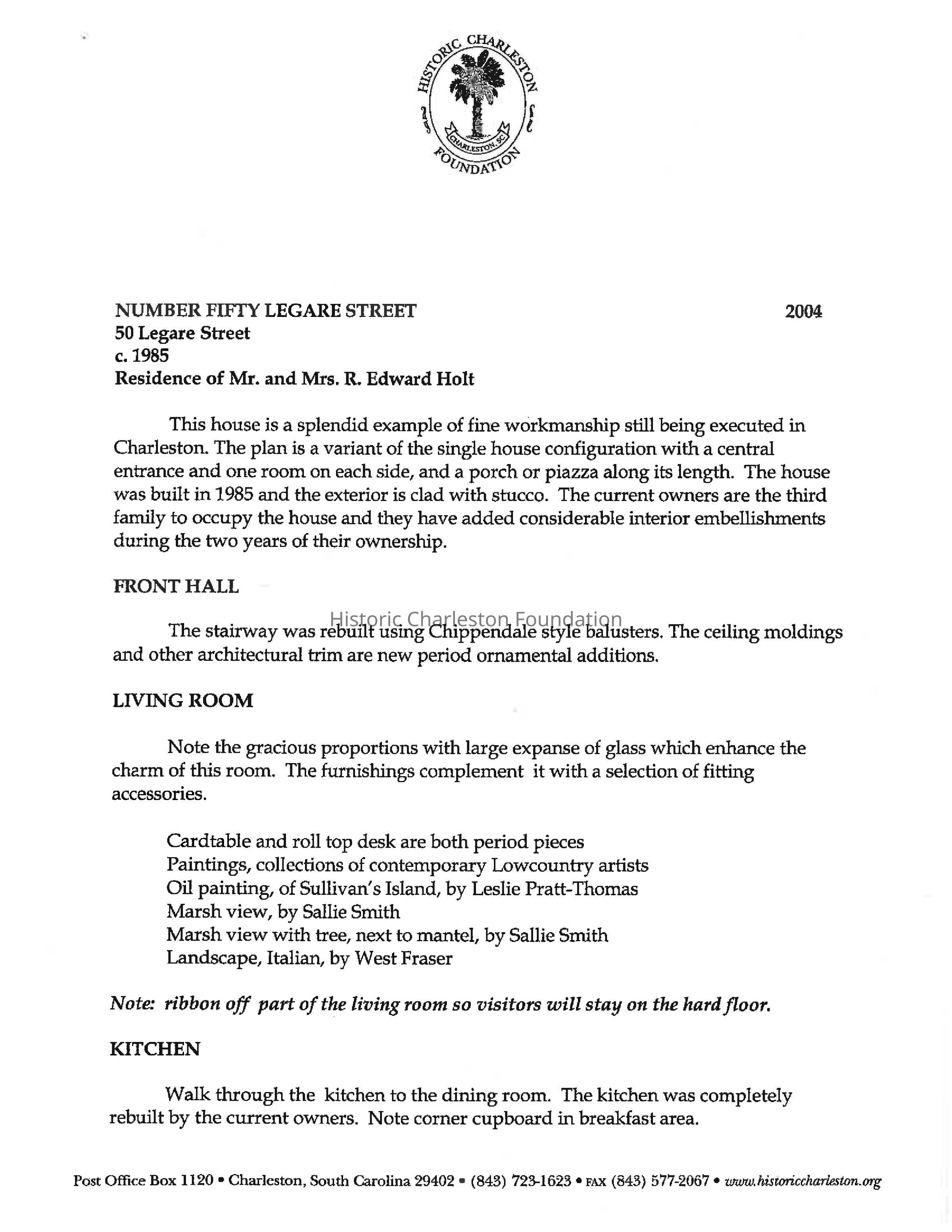 File contains 50 Legare Street FOHG house and garden histories (2004); 50½ Legare Street.FOHG house history (1991).