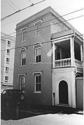 Constructed ca. 1839. Mary Elizabeth Burckmeyer Elsworth Eckhardt rebuilt almost immediately after the fire on this site. Her 3-story stuccoed brick single house rises to a flat roof disguised by a banded parapet. A later Italianate style doorway stands in the screen of the double-tiered piazza. The dwelling was purchased in the 1850s by Dr. John Burckmeyer Patrick, a dentist who perfected several new dental techniques. Patrick also built the two-story Italianate style struction with pedimented second-story window and balcony at 82 Society Street as his office. (Poston, Buildings of Charleston.)