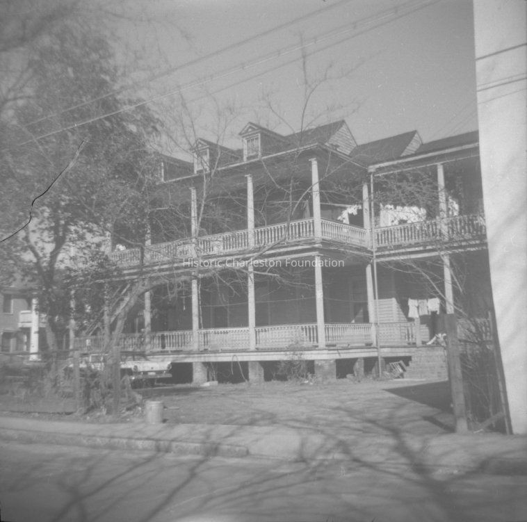 B&W photograph of 76 Anson Street before demolition. View of piazzas with laundry hanging from the second story. "ARP" Written on verso of photo.Collection