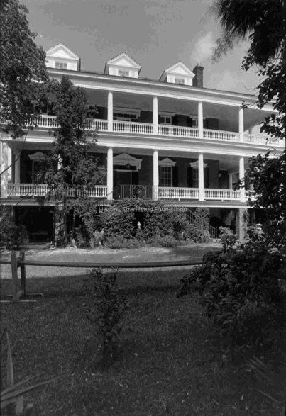 B&W photograph of the south elevation of 76 Ashley Avenue (John Hume Simons House). View of the piazzas from the lawn. Joggling board in foreground.Collection
