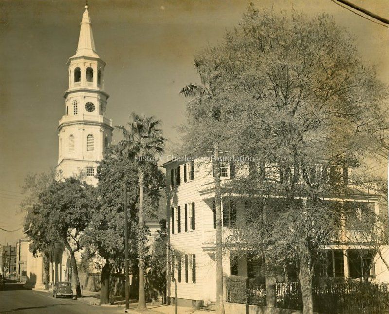 a: View of Meeting Street looking northeast showing a corner view of the house, west (front) and south (piazzas) elevations, St. Michael's Church, and the street slightly beyond. Car parked on street.