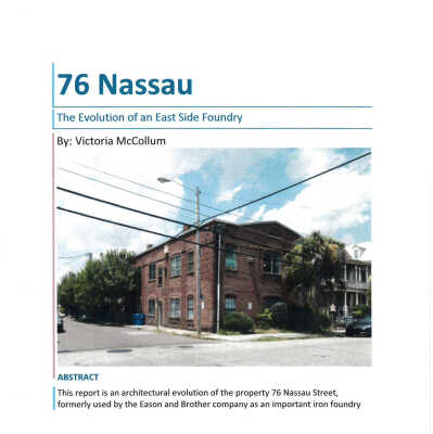 File contains graduate student report (Victoria McCollum, 2016) on the history of the building/property, which includes historical and chain-of-title research, maps, photos, and other supporting documentation; early advertisement for Eason Iron Works (source not indicated); biographical information on James Monroe Eason (author not indicated); description of Eason Iron Works (source not indicated).