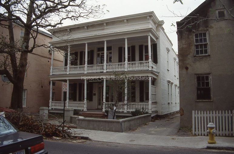Color slide of 76 Queen Street (Gibbes Museum Studio), taken soon after Hurricane Hugo. Slide dated November 2, 1989. Street (front) elevation.