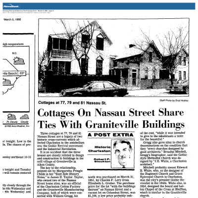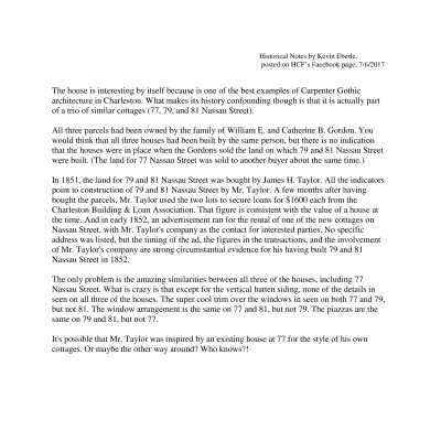 77 Nassau Street, 79 Nassau Street, and 81 Nassau Street were constructed ca. 1851-1852, the one at 77 by Charles F. Levy and the two at 79 and 81 by James H. Taylor. They are closely related in design and construction to buildings in the mill village in Graniteville in Aiken County.