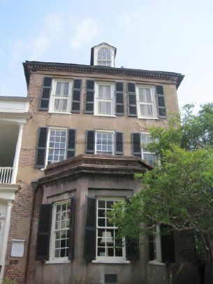 Constructed early 19th century as a service building for the main structure at 75 Tradd Street. It is a unique two-story, three-part brick and wood structure in three distinct units, with a gable roof clad in slate shingles and one large brick chimney capped with paired lancet arches.