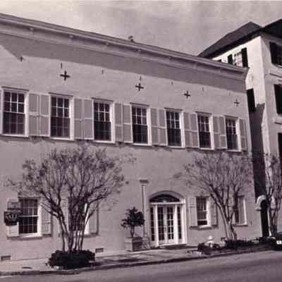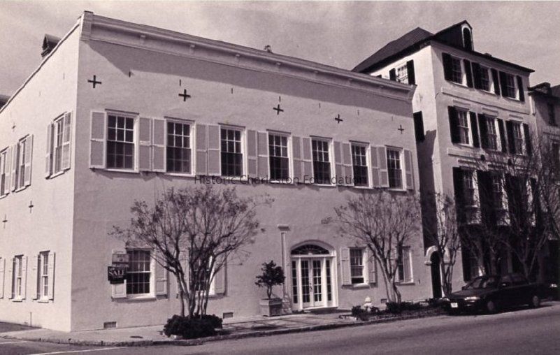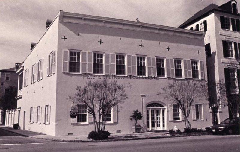 Two B&W photographs of the Lindsay-Bulwinkle Property (79-81 East Bay Street) taken at slightly different orientations, both showing the front (east) elevation and southeast corner of the building. Also shows the street corner at East Bay and Tradd Streets and the William Stone House (83 East Bay Street) (right).Collection