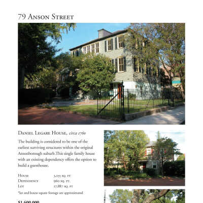 This is a new easement property so files will become more complete in time. Current files contain documentation of the easement on the property; correspondence related to the easement donation; acknowledgment of the easement donation; documentation of the sale of the property; easement appraisal report and IRS form 8283; request for alterations; correspondence related to the management of the property; Part I Certification Application and associated research including maps and wills (Sarah Fick, 2005); FOHG house history (undated); newspaper articles (including DYKYC 1934, 1958, 1971); report entitled "Architectural Investigation of 79 Anson Street" by Willie Graham, Carl Lounsbury, and Orlando Ridout V; conceptual plans; data sheet (79½ Anson) for CharlestonWISE Impact Project (Sustainability Institute) that includes construction date, square footage, number of stories, building orientation, system materials/types, Sanborn Map research notes, and additions/alterations notes (Mariah Schwartz, 2011); Meyers Properties sales material (includes photos, house history, news articles, main house floor plans, and kitchen house floor plans and photos); HCF sales brochure.
