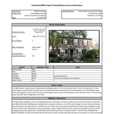 Current files contain documentation of the easement on the property; correspondence related to the easement donation; acknowledgment of the easement donation; documentation of the sale of the property; easement appraisal report and IRS form 8283; request for alterations; correspondence related to the management of the property; Part I Certification Application and associated research including maps and wills (Sarah Fick, 2005); FOHG house history (undated); newspaper articles (including DYKYC 1934, 1958, 1971); report entitled "Architectural Investigation of 79 Anson Street" by Willie Graham, Carl Lounsbury, and Orlando Ridout V; conceptual plans; data sheet (79½ Anson) for CharlestonWISE Impact Project (Sustainability Institute) that includes construction date, square footage, number of stories, building orientation, system materials/types, Sanborn Map research notes, and additions/alterations notes (Mariah Schwartz, 2011); Meyers Properties sales material (includes photos, house history, news articles, main house floor plans, and kitchen house floor plans and photos); HCF sales brochure.Created By