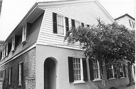 Constructed by 1726; rehabilitation mid-1980s. With its unusual surviving gambrel roofline, double tenement form, chimneys, and other features, the building at 8-10 Tradd Street has generally been ascribed to construction in 1726 due to surviving grants of common-use alleys on the eastern and western edges of the building. Thomas Lamboll, a merchant and horticulturist, constructed the brick structure, and, surviving the fire of 1778 more or less intact, it remained in the hands of his descendants until 1846. The gambrel or "dutch" roof form, common in mid-18th century Charleston, largely disappeared, particularly through early-20th century demolitions. Its presence on this building may point to circa 1750 replacement of an earlier roof form; the surviving roofline has been somewhat altered with 20th century tin covering and later shed dormers. (Poston, Buildings of Charleston.)