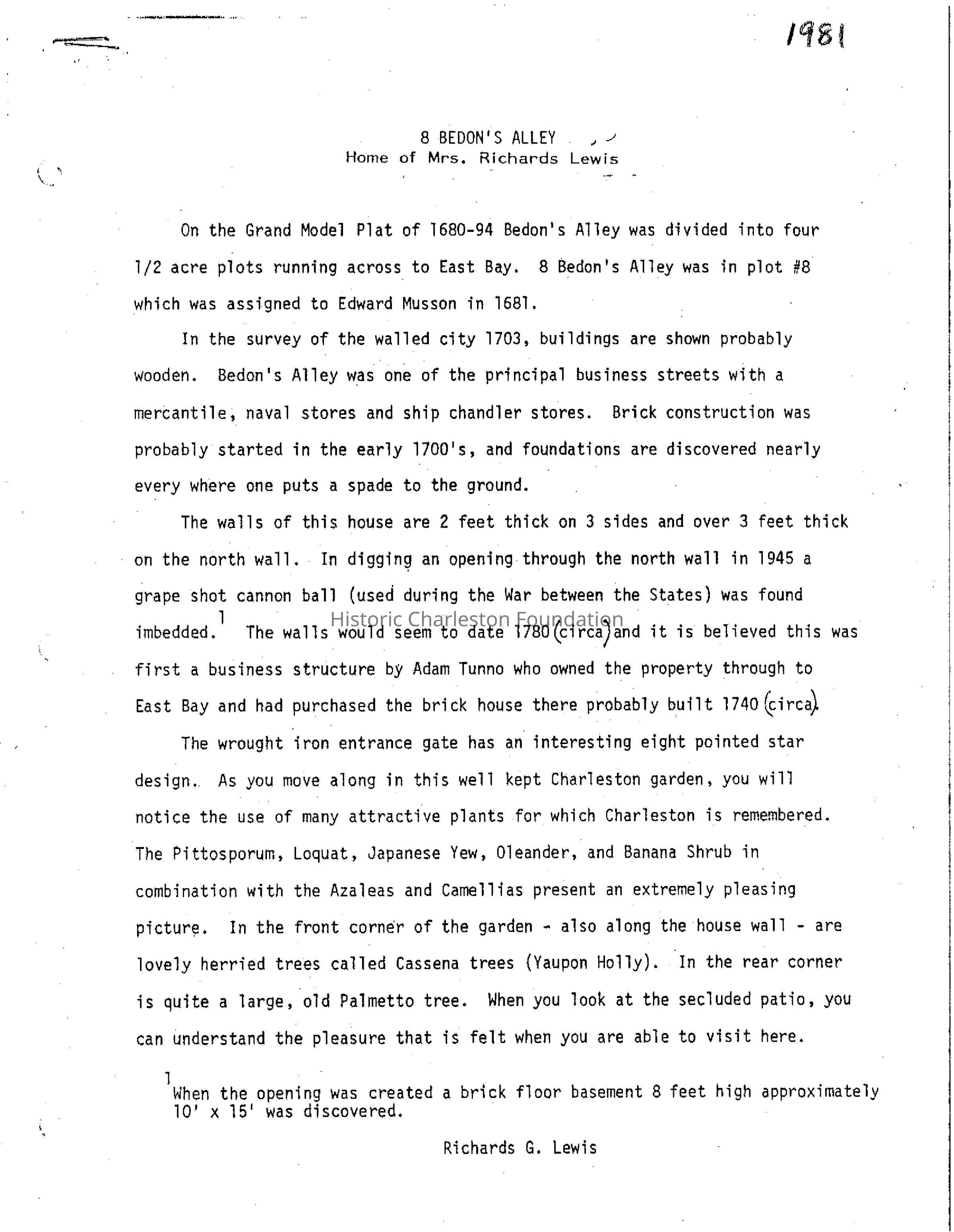 On the Grand Modell Plat, Bedon's Alley was divided into 4 half acre plots running across to East Bay; 8 Bedon's Alley was in plot #8, which was assigned to Edward Musson in 1681. Most of the small brick houses on the east side of Bedon's Alley were built as outbuildings for the large establishments in Rainbow Row, including 8 Bedon's Alley, which provided service functions for Scottish merchant Adam Tunno's large office and residence at 89 East Bay Street; he had purchased the brick house there probably built ca. 1740. The walls of this house are 2 feet thick on 3 sides and over 3 feet thick on the north wall. The walls seem to date ca. 1780. In digging an opening through the north wall in 1945, a grape shot cannon ball (used during the Civil War) was found imbedded. These structures were rescued in the 1920s and 1930s by Susan Pringle Frost and renovated as individual dwellings with the detailing and landscape treatments in the Colonial Revival style.