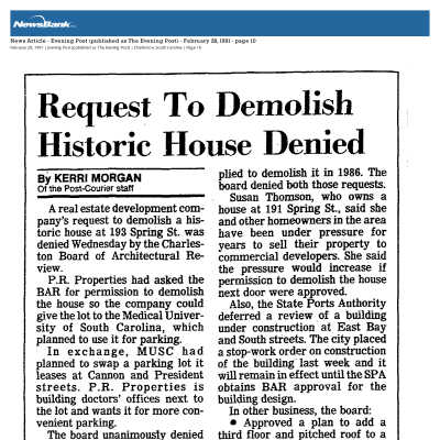 File contains: report "Outbuilding Historic Structure Evaluation" (Alexandra Jones/Houselore, 2018); excerpt from Information for Guides of Historic Charleston; newspaper article about the approval to add a third floor (2/28/1991).Collection