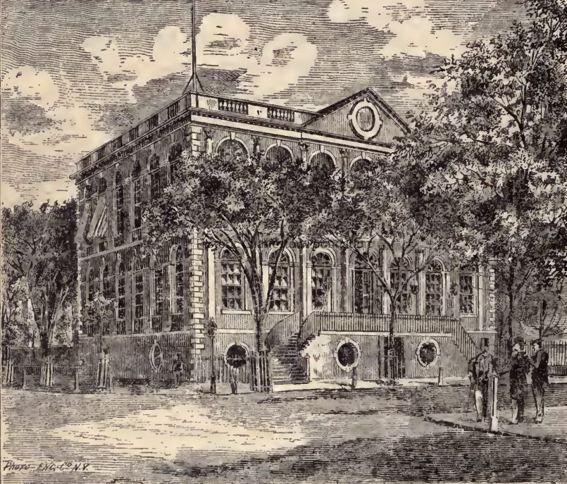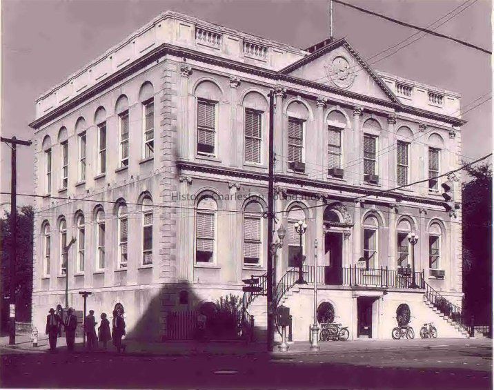 The second-oldest city hall in continuous use in America. Constructed 1800-04; altered 1839, 1882; repaired 1866, 1898, 1938. Attributed to Gabriel Manigault (architect, 1800-04); Charles Reichardt (architect, 1839); Edward Magrath and Joseph Nicholson (carpenters); Andrew Gordon (mason); Colin McK. Grant (renovation contractor, 1882). Formerly the location of the 1739 beef market destroyed in the fire of 1796. Conveyed to the Bank of the United States in 1880; served as a state bank from 1811-1818, when it was designated as the city hall. Extensive alterations in 1882 included a new metal roof, brick exterior stuccoed, and interior completely gutted and reordered with a large second-story council chamber across the central front. Today, retains its extensive Adamesque marble detailing with arched window architraves and lintels, quoining, and engaged columns of the Doric, Ionic, and Corinthian orders. (Buildings of Charleston by Jonathan Poston.)
