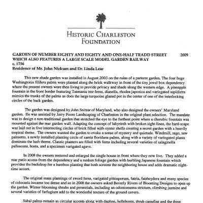 File contains FOHG garden histories (2008, 2009); "Special Features of Your Home" (excerpts from home appraisal, 2007); photocopy of captioned photograph of "carved mantel and English embossed iron fire place at the home of W. deBruyn ___rs, 80 Tradd Street" (source not indicated).Collection