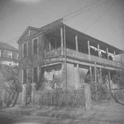 b: Street (front) elevation, cornier view showing piazzas with laundry hanging from the second story piazza. "ARP" written on back of photo.Collection