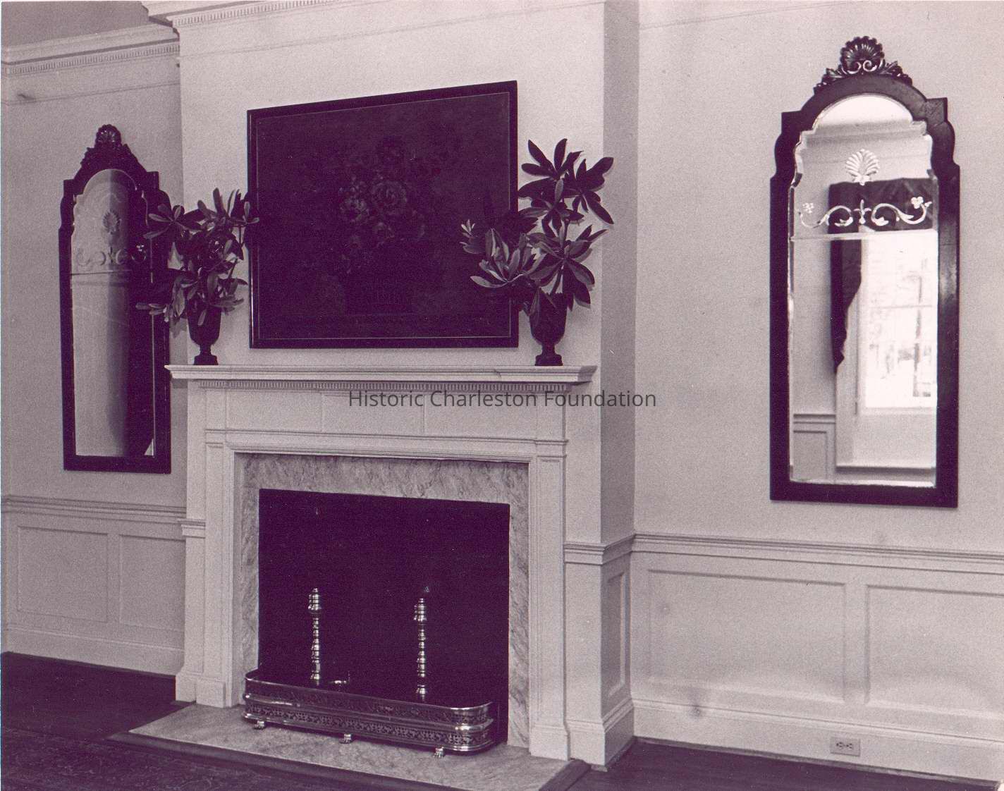 a: Fireplace and mantel, with two mirrors on the walls on either side.