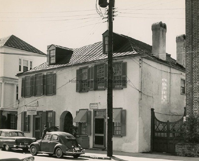 B&W photograph of 83-85 Church Street (Cabbage Row), street (east) elevation. Sign for House & Garden Shop projects over the 83 Church Street door. Sign for Eighty Five Church Street projects over the 85 Church Street Door. Cars (including a Volkswagen Beetle) are parked on street in front of building. Portion of 81 Church Street can be seen at left.Collection