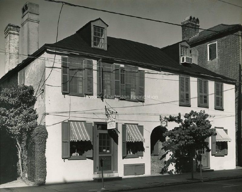 B&W photograph of 83-85 Church Street (Cabbage Row), street (east) elevation. Sign for House & Garden Shop projects over the door of 83 Church Street. Sign for Terrell's projects over the entry at the center of the building.Collection