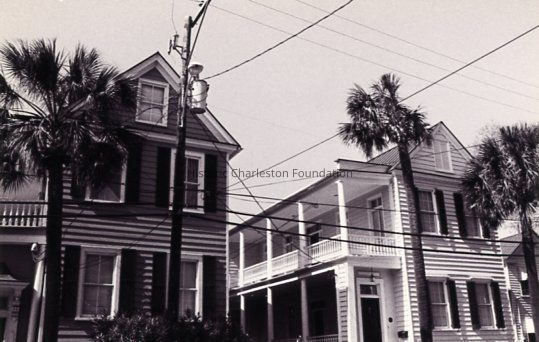 83 Alexander Street: Constructed 1881-82. An earlier house on this site owned by Benjamin Lee burned in the evacuation fire of 1865. A German tradesman built a traditional two-and-a-half-story Charleston single house on this site shortly after 1880. An Italianate style hood caps the piazza screen on the front of Tuscan-columned piazzas. With the exception of the screen and the two-over-two windows, the dwelling, with its closed gable and three dormers, continues in the Greek Revival style of single house construction.