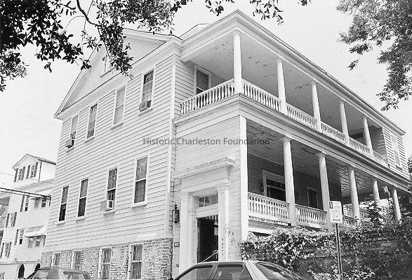 Constructed ca. 1827. A successful rice planter from the Mount Pleasant area built this massive double house with its side to the street, in the single house manner, in about 1827. The structure stands on a brick foundation and has a weatherboarded facade with four bays, a closed gable on the street side, and a double-tiered, Tuscan-columned piazza that faces a large garden lot. Past the piazza door screen a staircase rises to the main elevation and the front entry, which is surmounted by a fanlight with a decorative eagle carving. The original lot underwent subdivision on several occasions, including the 1841 severance of the property known as 82 Pitt Street. Whilden, who owned substantial town property in the developing Village of Mouny Pleasant, retained this as a townhouse for several years. The house was owned by the T.A. Wilbur family at the time of the earthquake of 1886. After the earthquake the house was rated in good condition except for collapsed chimneys.