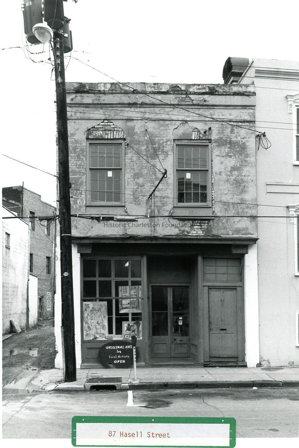 B&W photograph of 87 Hasell Street (Original Art by Local Artists), street (front) elevation showing alleyway and buildings to the east, now the Hasell Street entry to Charleston Place and its parking garage.