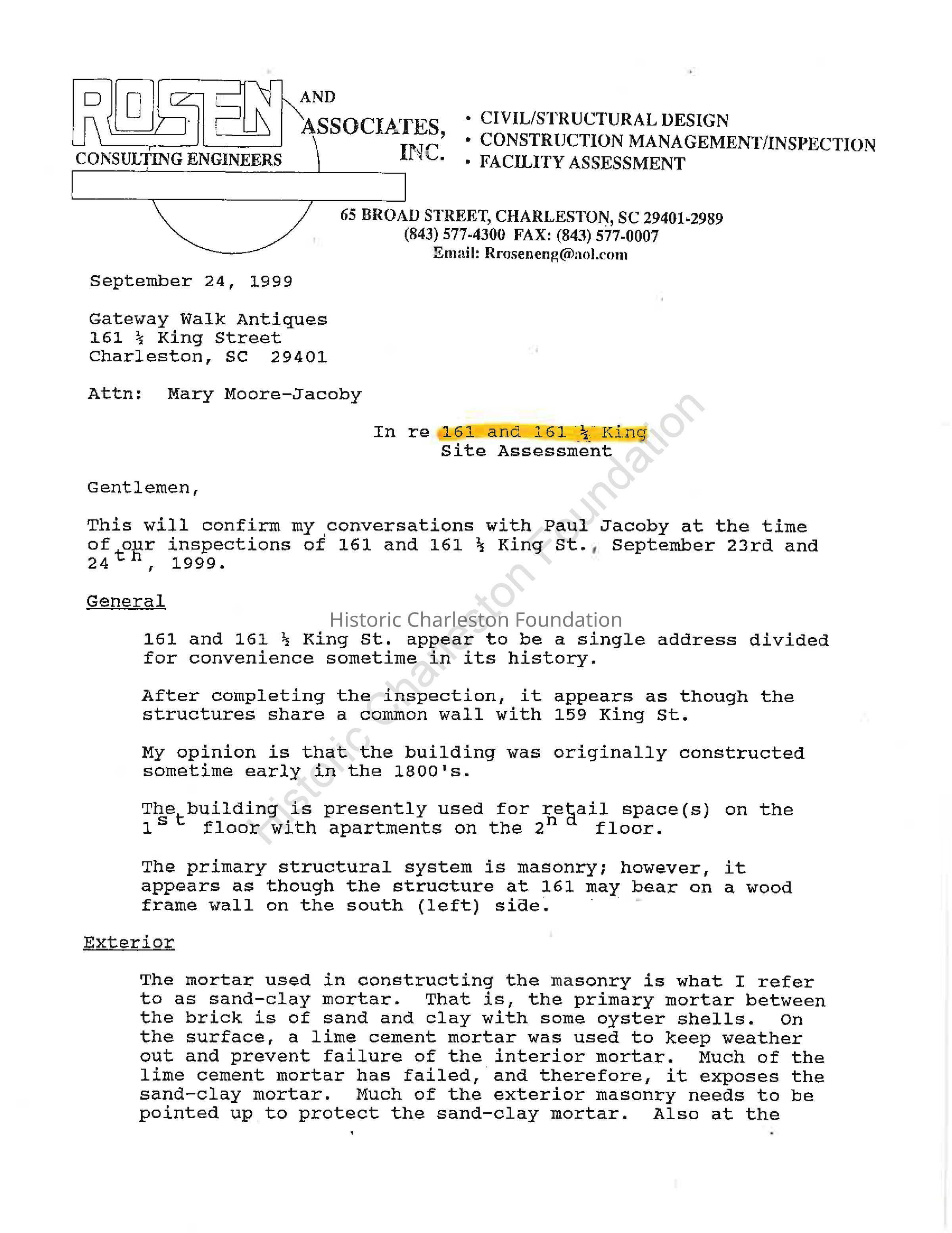 File contains Rosen and Associates (engineers) site assessment (1999); listing of 20th century residents from Old Codgers' Charleston Address Book.