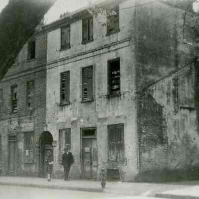 Two B&W photographs of 89-91 Broad Street (Catfish Row), front (east) elevation showing the northeast corner of the building. Building appears to be in disrepair, before restoration. Both photos feature the same view with slightly different camera orientations so that the two-tiered piazza of 93 Church can be seen in Photo A (and barely in Photo B). Man and woman are walking on the sidewalk in front of the building.Collection