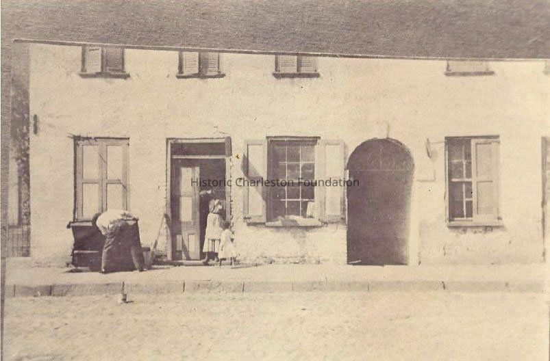 Photographic reprint of a photograph of 89-91 Broad Street (Catfish Row), front (east) elevation. Man in front appears to be opening the door to a basement while a woman and child in the doorway look on.