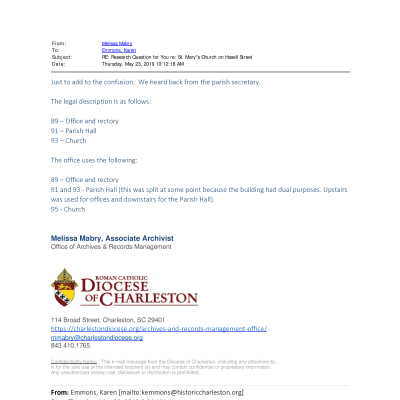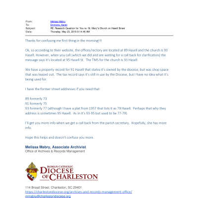 See Media tab for emails from Diocese of Charleston regarding address.Created By