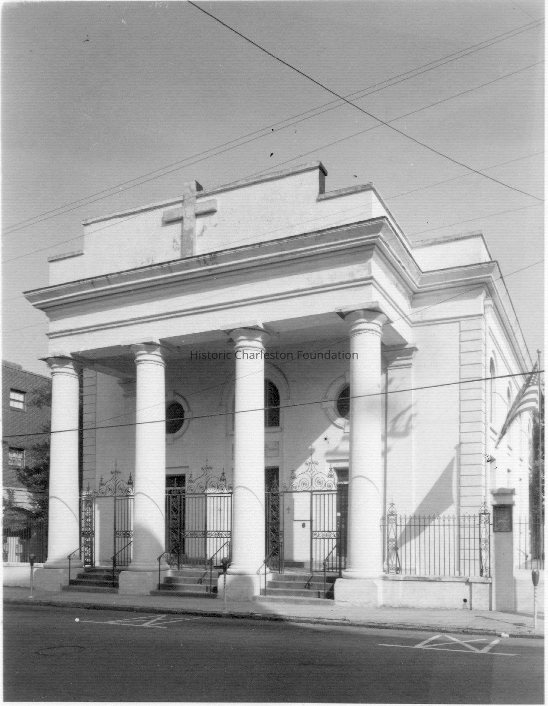 Constructed 1838-39. Christopher Kane, contractor. The present St. Mary's is the third church on the site of the first establishment of Roman Catholicism in the Carolinas and Georgia. Catholics in colonial Charleston worshipped quietly, as they were the only group not permitted toleration in the province from proprietary times. The first priest, the Reverend Ryan, found the local Catholics, numbering about 200, "few, poor and timid." After renting a Methodist meetinghouse on Hasell Street, the group purchased the site about the time that the congregation was incorporated by the SC legislature in 1791. With the first boats of refugees from the slave insurrection in French Santo Domingo, the number of congregants swelled. A handsome brick church was built under the direction of the Reverend Simon Felix O'Gallagher in 1801, but this building burned in 1838. A cornerstone was quickly laid for rebuilding on the site and the new church was completed in 1839. The present building follows a Robert Mills inspired tradition of the Classical Revival style already out of fashion in the 1830s. On the interior a fine 1814 altar painting by the local artist John Cogdell, rescued in the 1838 fire and restored by the artist for the new church, is surmounted by a ceiling executed by the decorative painter Chizzola. These images are in company with 23-three ceiling and wall paintings, copies of Roman masterpieces, by the Italian artist Cesare Portia, that were installed in 1896. The spectacular stained glass windows were completed in two campaigns by the Franz Mayer Firm of Munich. One of the most significant facets of St. Mary's is its graveyard, which holds the burials of 18th and early-19th century immigrants of French, Irish, Italian and Spanish extraction. Two daughters of the Comte De Grasse, the French admiral who helped George Washington secure victory at Yorktown, are buried here among other French refugees of the West Indies. (Poston, Buildings of Charleston.)