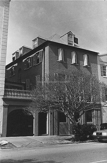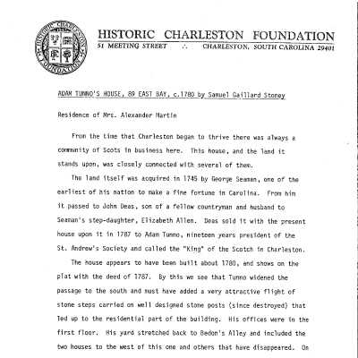Constructed ca. 1780-87. The Scottish merchant George Seaman owned this property. It passed from him to his friend David Deas and then to Deas's nephew John Deas Jr., married to Seaman's step-daughter. Seaman's tenement was destroyed in 1778, and Deas rebuilt the present house either during or just after the Revolution. Adam Tunno, who rose to be one of Charleston's richest merchants, bought the property in 1787. Tunno, called the "King of the Scotch in Charleston," served as steward of the St. Andrews Society until his death in 1834. One story retains its original fenestration and interior on its upper floors. A stone-lined cellar, possibly used for wine and spirits, survives under the structure. The lower story was remodeled with a garage and service addition to the south in 1936 with the assistance of the Charleston restoration firm of Simons and Lapham. Tunno's property stretched to Bedon's Alley, and his extensive outbuildings, including slave quarters and former warehouses, today comprise some of the finest restored residences on the alley. (Poston, Buildings of Charleston.)