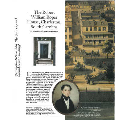 File contains house history from Vernacular Architecture of Charleston and the Lowcountry; house history from Architectural Guide to Charleston; National Register Nomination Form; excerpt from 62 Famous Houses of Charleston; FOHG house histories (1992, 2004); FOHG garden history (2004); reduced-size copy of HABS drawings; draft of FOH house history (undated); letter from Lawrence Walker to homeowner regarding concerns about masonry work being done (1899); article from The Magazine Antiques (5/1990).Collection