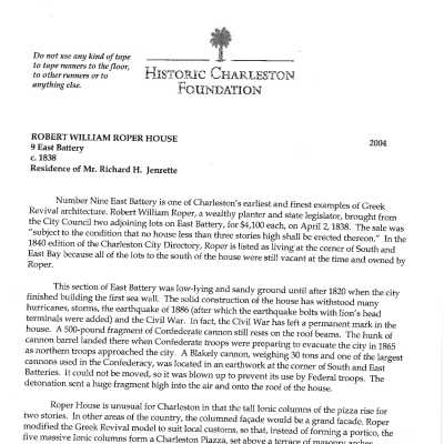 9 East Battery (Robert William Roper House)Entry/Object ID