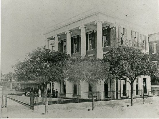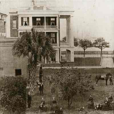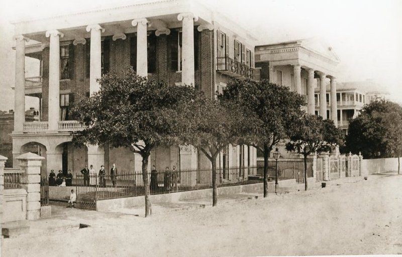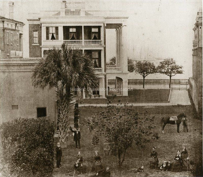 a: Southeast elevation. View of portico. Several people are assembled on the grounds. East elevation 13 East Battery with its Tower of the Winds Corinthian columns is also in view. (Columns were later destroyed by the earthquake.)