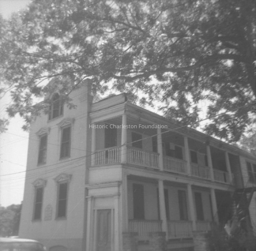 B&W photograph of the Robert Roulain House (9 George Street), corner view of building, north (front) and west (piazzas) elevations.
