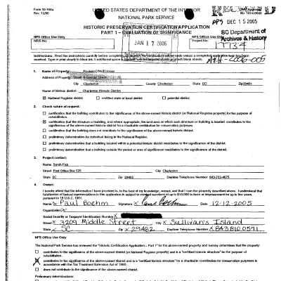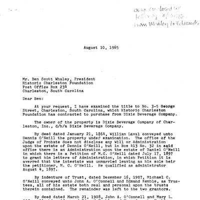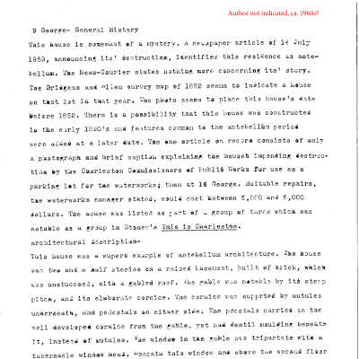 Three files contain documentation of the easement on the property including related correspondence including Confirmation of Understanding and "conceptual approval" letter; Part I certification (National Register); easement appraisal report and IRS form 8283; annual inspection reports, requests for alterations, and correspondence related to the management of the property; documentation of HCF's purchase of the property including rights-of-first-refusal; documentation of the sale of the property; house history (unattributed, ca. 1960s); newspaper article (DYKYC); excerpt from Old Codgers' Charleston Address Book (pdf); historical/chain-of-title research information; Sanborn maps; plats (1969, 2001); copy of HCF easement information card (TMS number, year of construction, significant resident(s), deed research, deed restrictions, measurements, and tax information); photocopies of plats: Sarah Fick's 2004 notes.