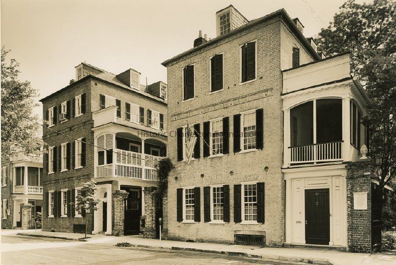 B&W photograph of 90-92 Church Street, street elevation, showing the southwest corners of the houses. 90 Church (Thomas Legare House) at right and 92 Church (Alexander Christie House) at left. The edge of 94 Church (Cooper-Bee House).Collection
