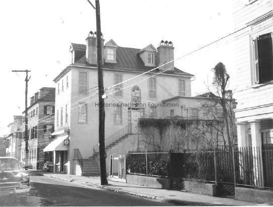 Ca. 1960 B&W Polaroid photograph of the streetscape at the corner of Tradd Street and King Street, street elevation. 94 Tradd Street (Samuel Wainwright House) is the most prominent building, with portion of 92 Tradd Street visible in foreground (right) and 96 Tradd Street visible in the background. Awning over 94 Tradd Street indicates commercial use, presumably when it was Schwettman's Drug Store, before the building was returned to residential use.