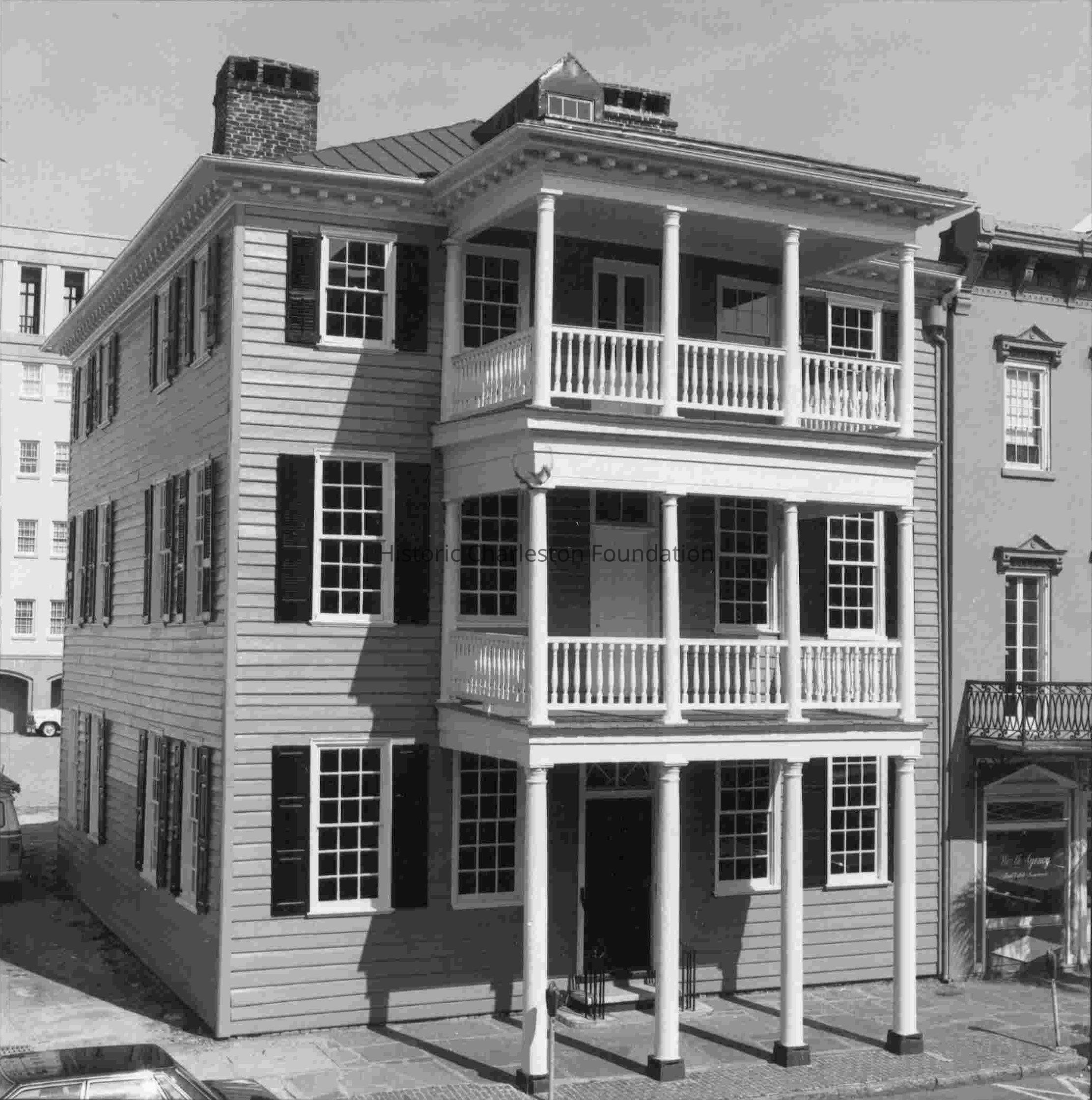 B&W photograph of 92 Broad Street (David Ramsay House), view of the south (front) and west corner of the building. Porticoes are featured.Collection