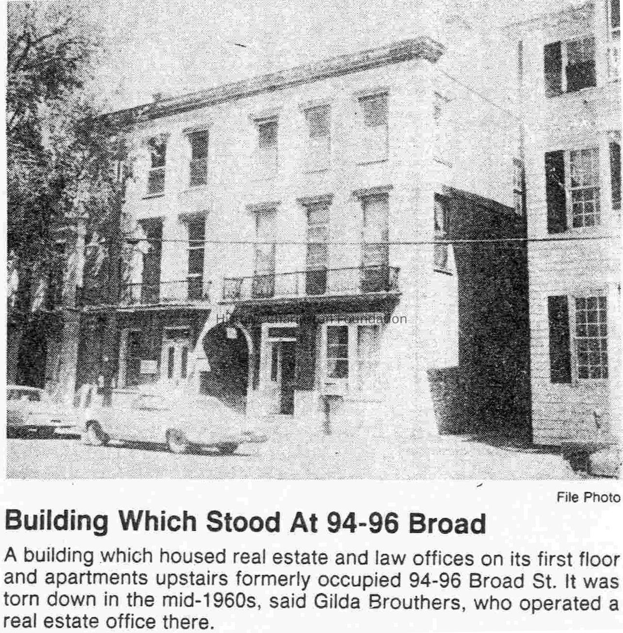 The building which had stood at 94-96 Broad Street had housed real estate offices on its first floor and apartments upstairs. It was torn down in the mid-1960s. The building previously located at 8 Courthouse Square was relocated to this site. (No other historical information on file.)