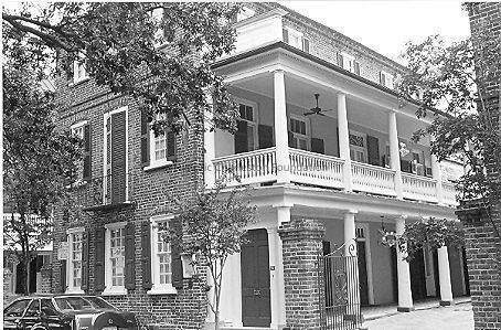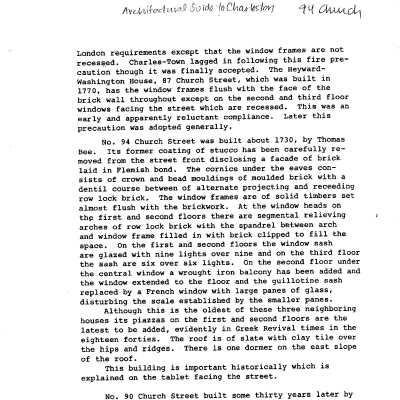 Constructed ca. 1760-65; various 20th-century restorations. The houses at 90-94 Church Street were called by the late architectural historian Samuel G. Stoney "three variations on the theme of the Charleston 'single house.'" Each reflect the development of the single house from the mid-18th century. The clients who contracted for the three 3-story brick houses -- Leger, Christie, and Cooper -- were all wealthy and socially prominent individuals whose architectural aspirations, according to one architectural historian, defined Charleston's early townhouses as "a union of cosmopolitan and vernacular building traditions." 94 (and 90) Church Street was constructed in the 1760s as a 3-story, hipped roof, center-passage plan dwelling with ground-floor front commercial rooms or offices. The site at 94 Church Street includes a narrow passage behind the house providing access to the neighbors' back buildings on the interior of the block. Each of the three edifices retain splendid original woodwork. During the early- to mid-19th century, the Cooper-Bee House received all new outbuildings and gained 2-story piazzas as well. All 3 houses underwent the removal of their commercial usage, and the houses were physically connected to their back buildings, showing a segregation between work space and domestic space and reflecting a topographically redefined central business district. The latter change in which individual buildings on the lot were connected with infill wings represented a 2-part shift in lot planning toward, first, the consolidation of household functions under a single roof and, second, a growing sense of room specialization. The house was returned to single family usage in the 20th century. 94 Church Street served briefly as the spring tours headquarters for Historic Charleston Foundation, and has been extensively restored by its owner in recent years with a contemporary renovation of its rear hyphen. (Buildings of Charleston by Jonathan Poston.)