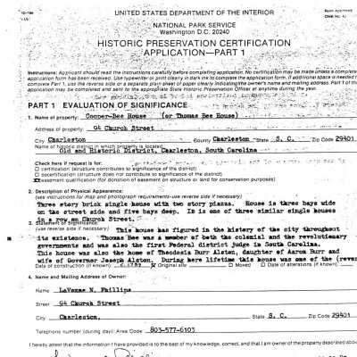 Files contain documentation of the easement on the property including related correspondence and Confirmation of Understanding; Part I certification application (National Register); easement appraisal (1983) which includes historical background, architectural description, and plats and maps; annual inspection reports, requests for alterations, and correspondence related to the management of the property; house description from HCF Festival of Homes tour booklet (1955); house history from Architectural Guide to Charleston (Thomas & Simons); house history from Vernacular Architecture of Charleston and the Lowcountry; house history from Information for Guides of Historic Charleston (1984); house history from City of Charleston Tour Guide Training Manual (2011); brief building assessment (Edward Chappell, 1995); magazine and newspaper articles (including 1980 DYKYC); photocopies of photos; info from MESDA regarding stair carving; report entitled "Thomas Bee's House Stair Hall Finishes Analysis" by Black & Black, Preservation Consultants, and George T. Fore & Associates (includes photos and paint samples).