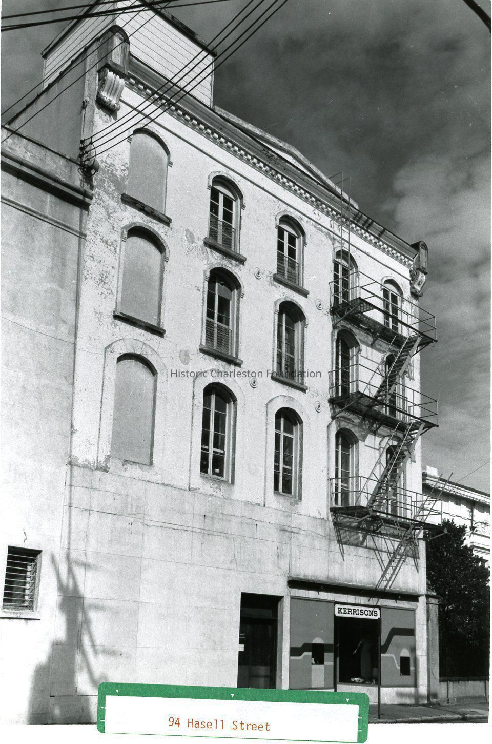 B&W photograph of 92 Hasell Street [a/k/a 94 Hasell Street], the side entrance to Kerrison's Department Store, street (front) elevation. The Kerrisons Building is an L-shaped building at 260 King).