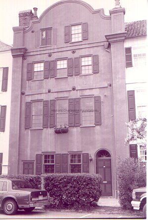 This building is part of the row of structures erected by Col. Othniel Beale in the mid-18th century, whose residence was located in the pink double house at 101 East Bay. The facade of this house features a distinctive curvilinear gable and shares the pilaster treatment with its northern neighbor. The entrance with a fanlight is set into an arched opening outlined in rope molding. It shares the egg and dart mold and pilaster treatment with its northern neighbors. It appears to have survived the fire of 1778 unscathed so its construction date is sometime after the earlier fire of 1740. One of its owners was Charles Cotewsorth Pinckney. This structure was part of the Rainbow Row, East Bay renovation in the 1930s, and it was probably at that time that the storefront was replaced by two windows.