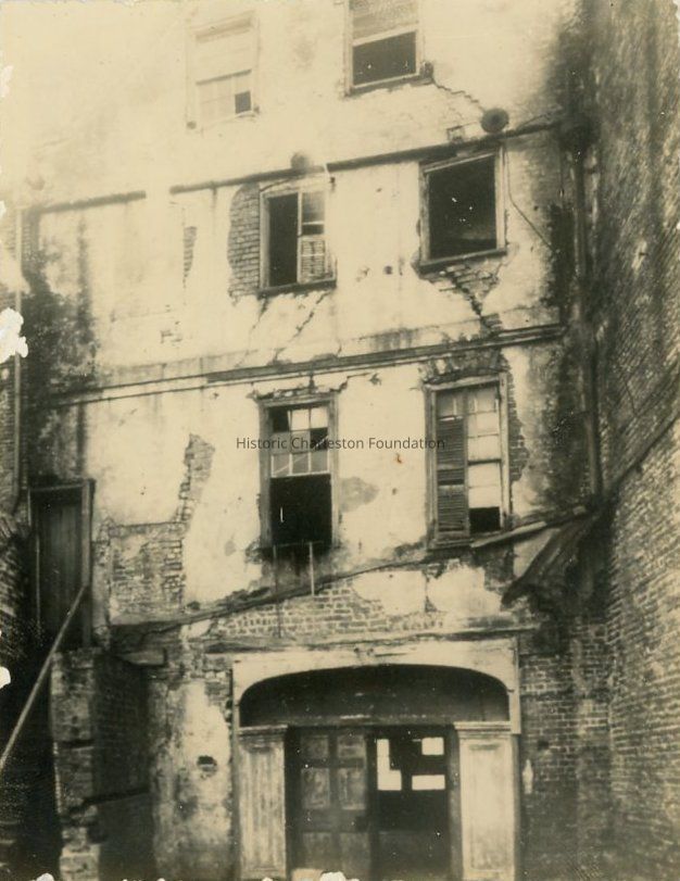 B&W photograph of the rear of 95 East Bay (Othniel Beale houses), before restoration. Shows the general disrepair of the building, the rear entrance, and broken and missing windows.Collection