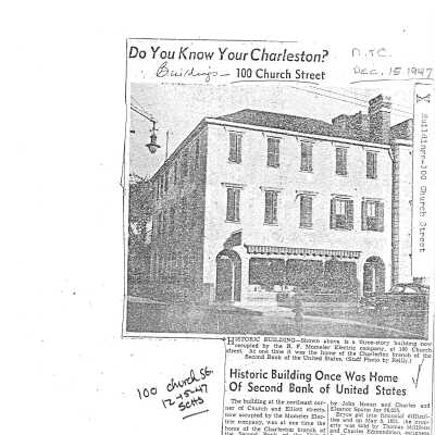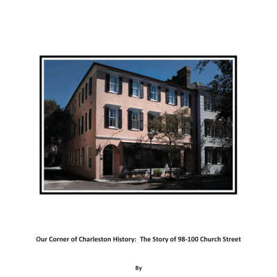 File contains newspaper article (1947 DYKYC); report entitled "Our Corner of Charleston History: The Story of 98-100 Church Street" by homeowner Kathryn A. Banks (2013) (includes historical/ownership research, maps, photos, and other supporting documentation); historical research report (Lavelle, Aug. 2016).Collection