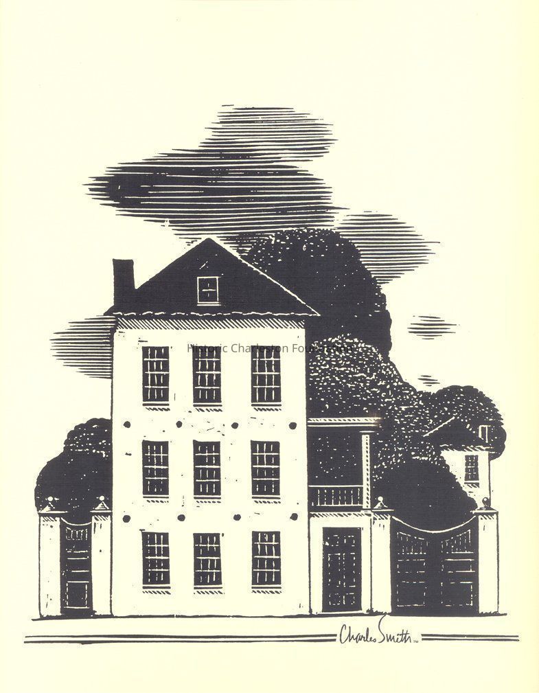 Reprint of woodcut depicting a Charleston single house, from book "Old Charleston Twenty-Four Woodcuts" by Charles W. Smith.Collection