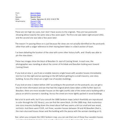 Postcard (scan) featuring the view looking west on Beaufain Street (the 30 block) showing the African American neighborhood that was between Coming Street and near Archdale Street, where today the triangle of land between Memminger and the Canterbury House (near St. Philip and Archdale) are now. The houses were demolished. Mule-drawn cart on street. Building in foreground appears to be a vegetable market, with bananas hanging in front and produce on a shelf underneath.Collection