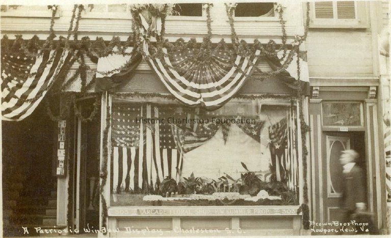 Reprint (enlarged) of a photographic postcard showing a store window decorated with American flags possibly, based on the estimated date of the image, in celebration of the Confederate Veterans Reunion. The building is numbered 303 [King Street], "Arcade Floral Shop, F.W. Kummer, Proprietor." To its right is the doorway to the building numbered 305 [King Street], the "[YMCA] Colored Men's Branch." A pedestrian walks in front of the doorway.Context