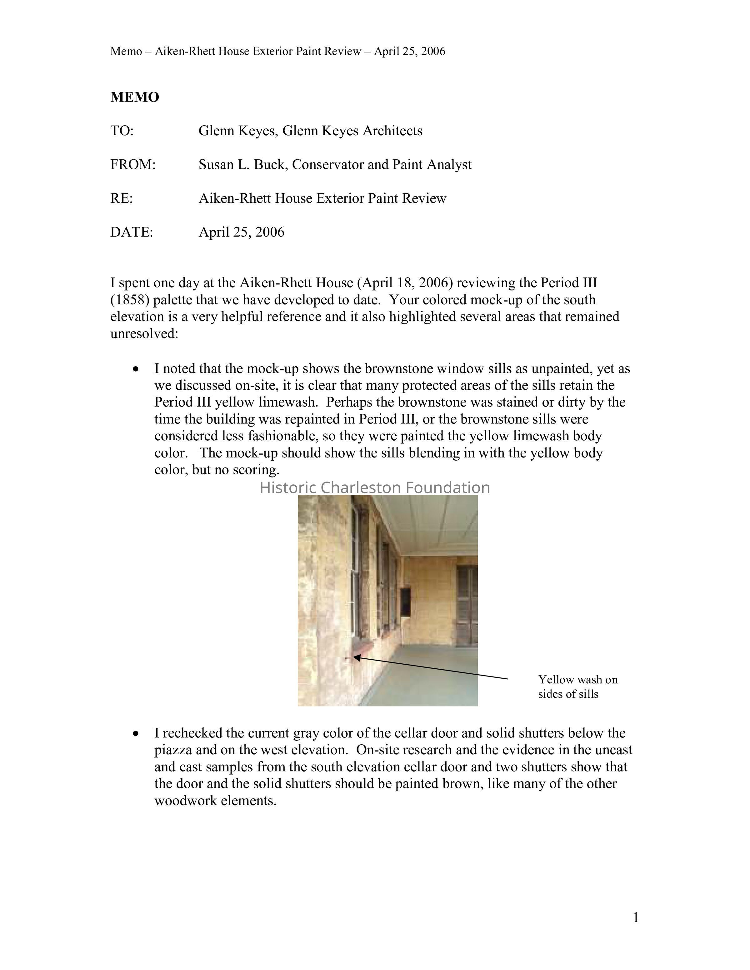 Additional paint analyses done by Susan Buck for Glenn Keyes Architects. Contains memorandum "Aiken-Rhett House Exterior Paint Review" (4/25/2006), and "Aiken-Rhett House Front Door Interior Finish Sample: Cross-Section Microscopy Analysis Results" (11/29/2006).