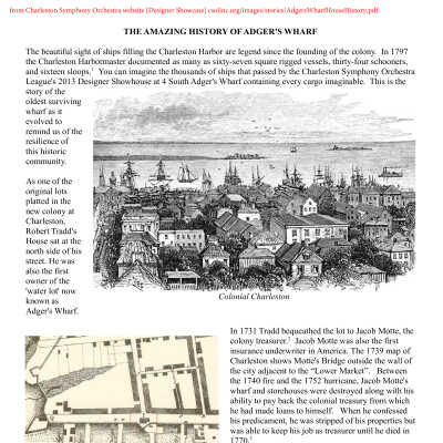 From Charleston Streets (website): Adger's Wharf is one of the several streets in the made land to the east of East Bay Street, which still carry the names of wharves. Adger's Wharf began its history as a "low water lot" (land exposed at low tide) belonging to Robert Tradd and situated across Bay Street (now East Bay) from his residence at Tradd and the Bay. Robert Tradd, a son of Richard Tradd and, according to tradition, the first English child born in South Carolina, died in 1731, bequeathing the "Water Lot" to Jacob Motte and his children. Motte was for many years the Public Treasurer of South Carolina and was also a prominent merchant, a sometime partner of James Laurens (brother of Henry Laurens). He built on Tradd's low Water lots a large wharf known as "Motte's Wharf" or "Motte's Bridge." Buildings on Motte's Wharf included a "scale house," where items were weighed, and which apparently was large enough for Motte to locate his office and store there after the great fire of 1740. North of Motte's Wharf, which later became known as Adger's South Wharf, was Greenwood's Wharf, which later became known as Adger's North Wharf. Greenwood, a British merchant in Charles Town, was one of the consignees of tea, taxed under the Tea Act of 1773.